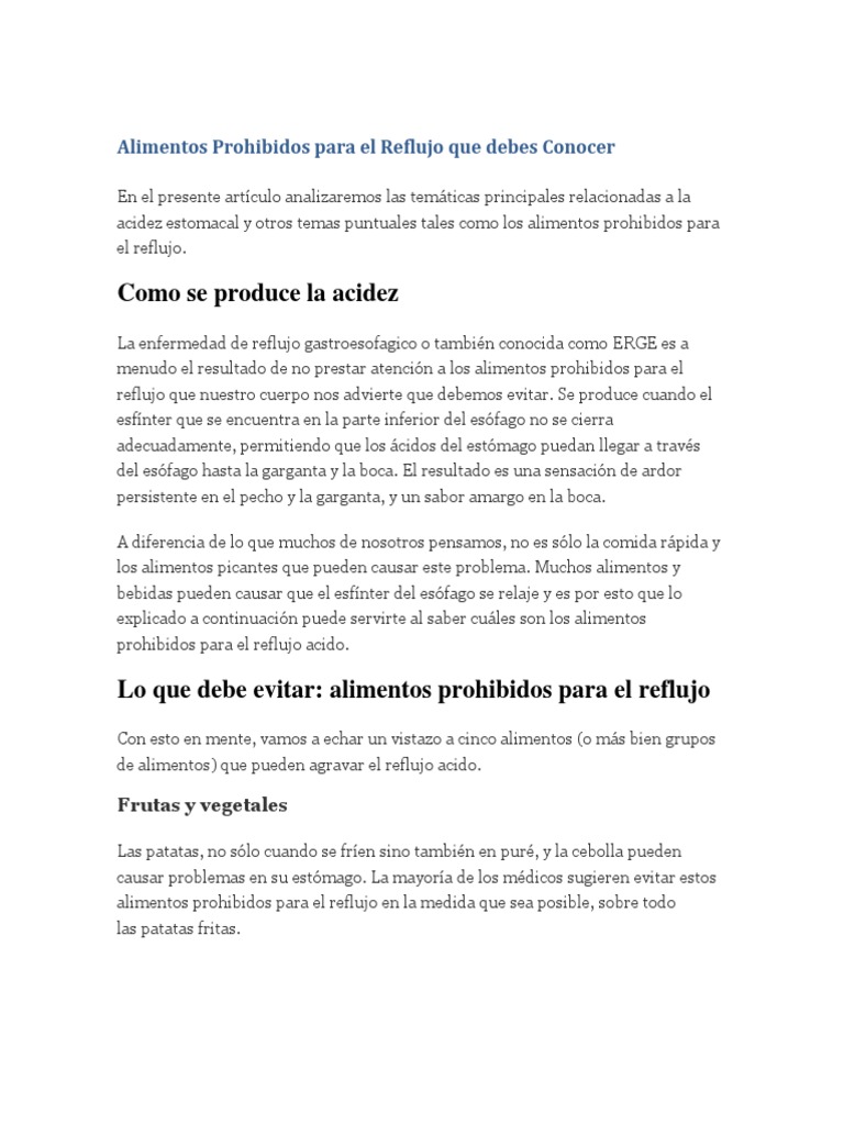 Alimentos Prohibidos Para El Reflujo. El reflujo ácido se produce cuando hay reflujo ácido desde el estómago hacia el esófago. Frutas y vegetales Las patatas, no slo cuando se fren sino tambin en pur, y la cebolla pueden causar.