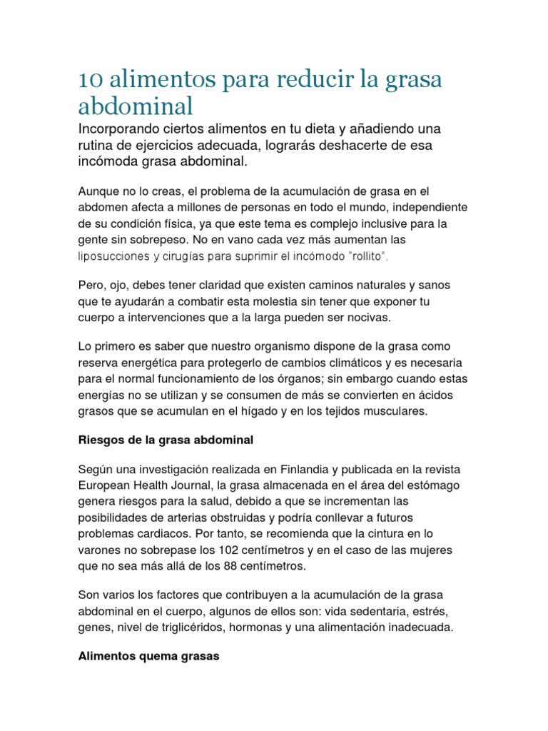 Alimentos Reducir Grasa Abdominal. Reducir la grasa en el área abdominal puede ser una tarea complicada. Los mejores alimentos para quemar grasa del abdomen.