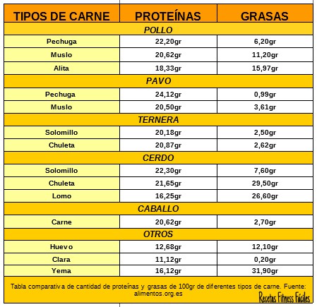 Tabla comparativa de proteínas en diferentes alimentos I (carnes) Recetas Fitness Fáciles ...